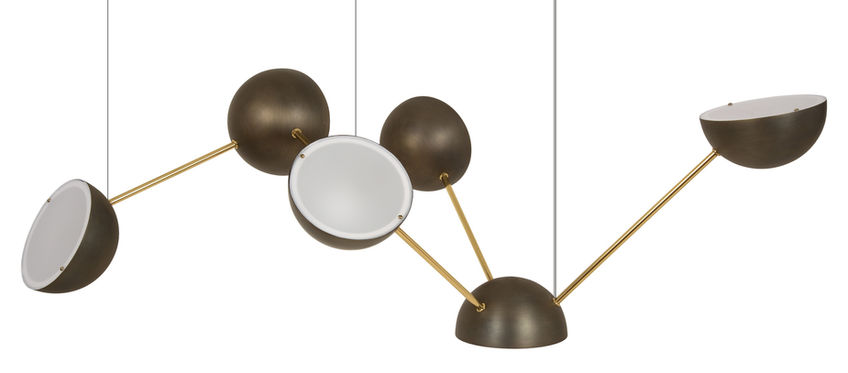 Cúpulas unidas por hastes em composição geométrica, a luminária Molécula é estruturada como um conjunto de átomos. Filtradas através de difusores, as luzes emitem um efeito tridimensional no espaço.