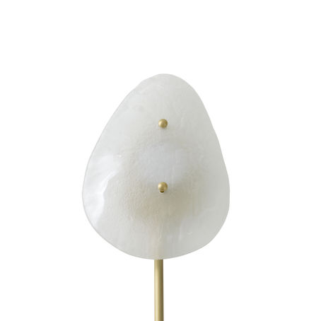 As hastes em latão direcionam de forma orgânica e harmoniosa as diferentes cúpulas de vidro soprado. Pequenas bolhas são formadas durante o processo de sopro do vidro, criando uma textura única. Essas bolhas aparecem de maneira sutil no vidro fosco por dentro, proporcionando um contraste interessante com o brilho e a transparência do vidro por fora.
